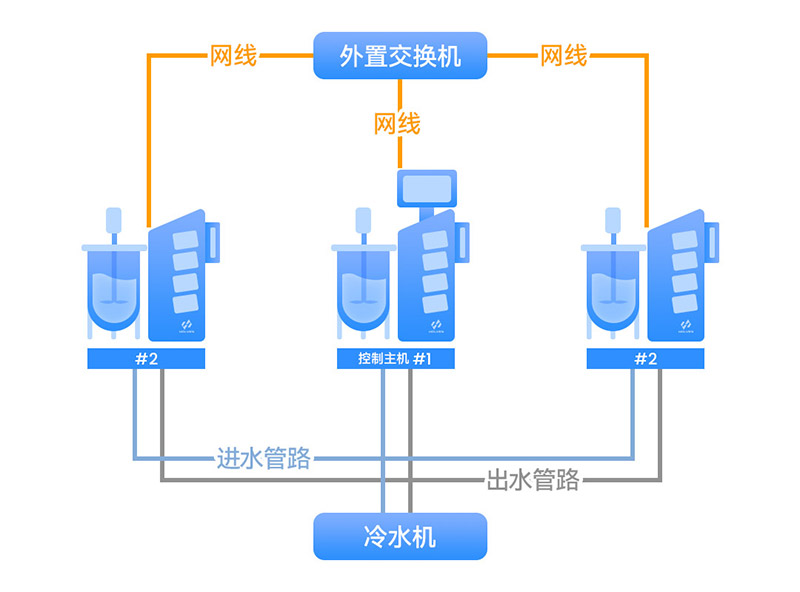 Cla多聯(lián)系統(tǒng)是類似搭積木的方式,將功能模板與機(jī)箱、罐體進(jìn)行聯(lián)合。每個(gè)罐體的參數(shù)監(jiān)測(cè)電極線與機(jī)箱連接,另外置交換機(jī)通過網(wǎng)線將每個(gè)機(jī)箱連接,進(jìn)行數(shù)據(jù)傳輸、控制,由其中一臺(tái)機(jī)箱配置14寸HMI進(jìn)行總控。