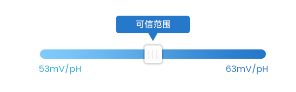 ⑦ 根據(jù)能斯特方程理想狀態(tài)下(25℃)時(shí),理想斜率為59mV/pH,即溶液每變化一個(gè)pH值,電極就產(chǎn)生59mv的電位變化。那么理想校正下,斜率應(yīng)在59mV/pH左右。當(dāng)斜率的值小于53mV/pH或者大于63mV/pH時(shí),需要更換新的pH電極,所以當(dāng)校正斜率在53~63mV/pH范圍時(shí),結(jié)果是可信的。