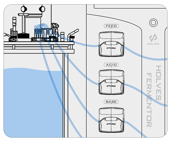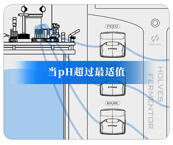 以霍爾斯(HOLVES)實驗室發(fā)酵罐為例,pH電極測定完數(shù)值后,結果會直接反饋給HF-Control V2.2控制系統(tǒng),系統(tǒng)則會根據(jù)原先設定數(shù)值進行調節(jié)補料等操作,將罐內pH值控制在最佳范圍內。