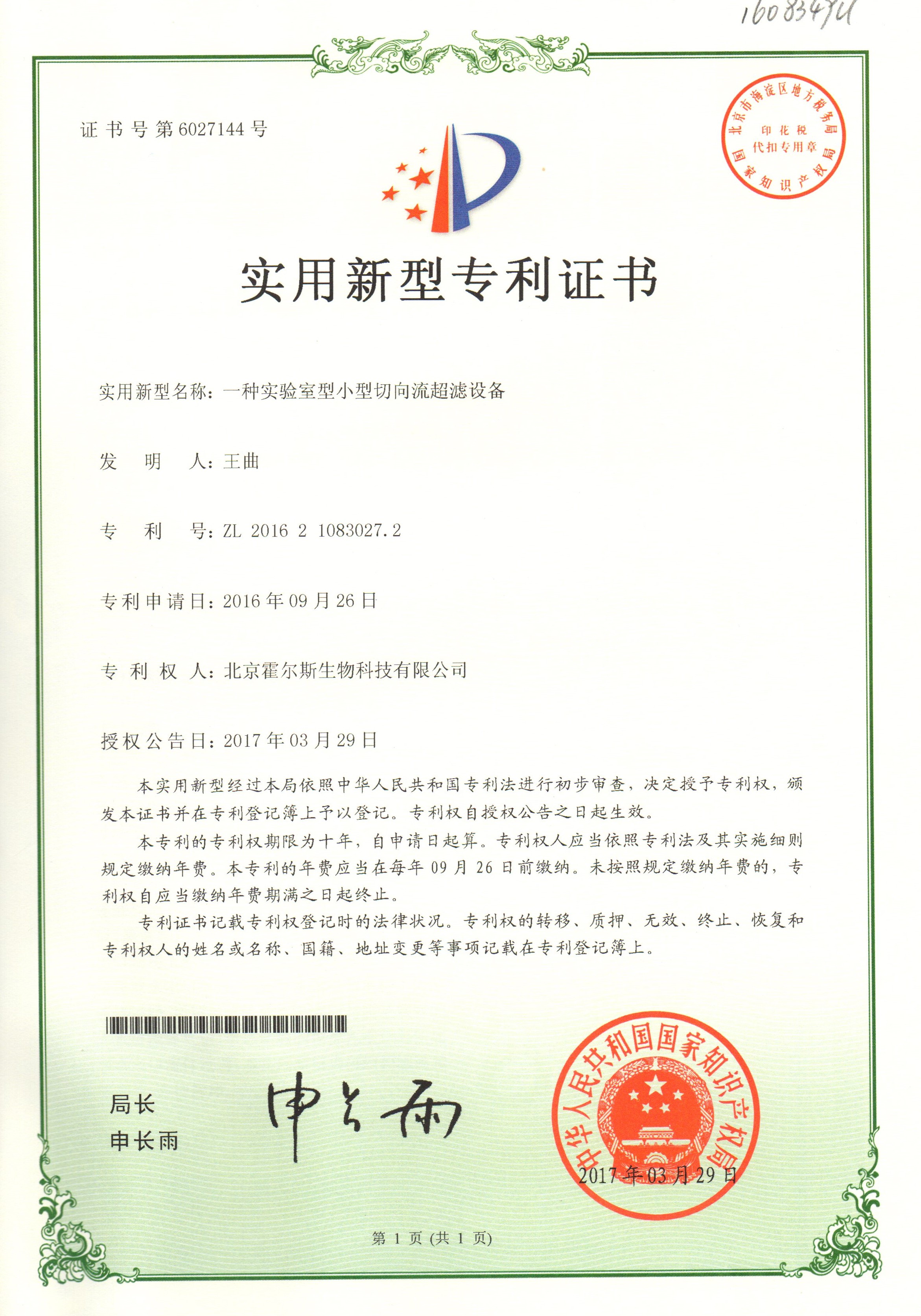 霍爾斯獲得切向流過濾設(shè)備的專利