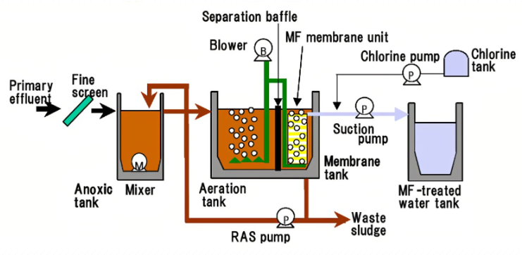 膜生物反應器是一種新型的廢水處理系統(tǒng),它結合了膜分離技術和生物處理技術,也稱為MBR。傳統(tǒng)的生物處理技術被終端二沉池膜組件取代,可以保持生物反應器中高活性污泥濃度,有效提高生物處理有機負荷。為了減少污水處理設施的占地面積,污泥負荷可以保持較低,從而減少剩余污泥的量。主要原理是使用膜分離設備攔截水中的活性污泥和大分子有機物。其活性淤泥濃度可達8000~10000mg/L,或更高。反應器截留效果非常明顯,可有效保留長周期微生物,實現(xiàn)污水深度凈化,增加硝化細菌增殖,除磷脫氮效果更好。