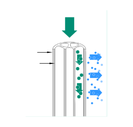 與硅藻土過濾相比,膜過濾主要是一種表面錯流過濾。固形物被截留在膜表面或膜的孔隙中。當(dāng)產(chǎn)品以一定的流速流經(jīng)膜表面時,這些固形物被沖走并保持懸浮狀態(tài),因此膜表面保持干凈、有效。運行一定時間后膜慢慢被堵塞,這時候必須進行化學(xué)清洗。需要過濾的產(chǎn)品流經(jīng)膜的通道:部分液體透過膜成為濾液(2),而截留液(1)繼續(xù)流動。